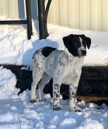 Buff is the last available pup of our 2022 litter. He is mainly white with black on his head and a black patch on his back, and lots of freckles!