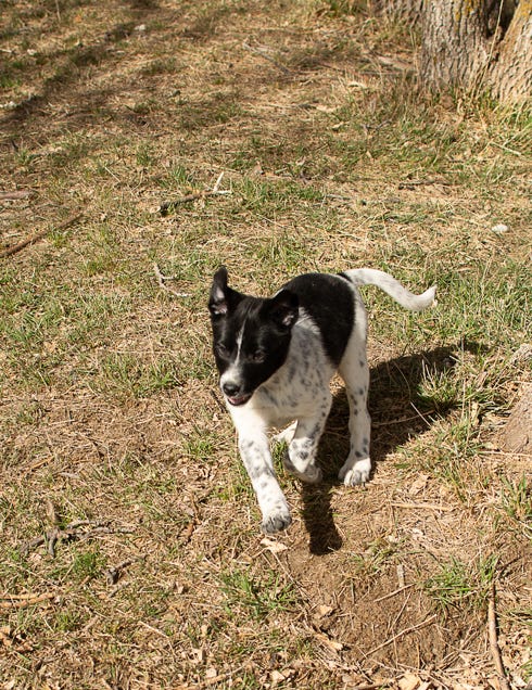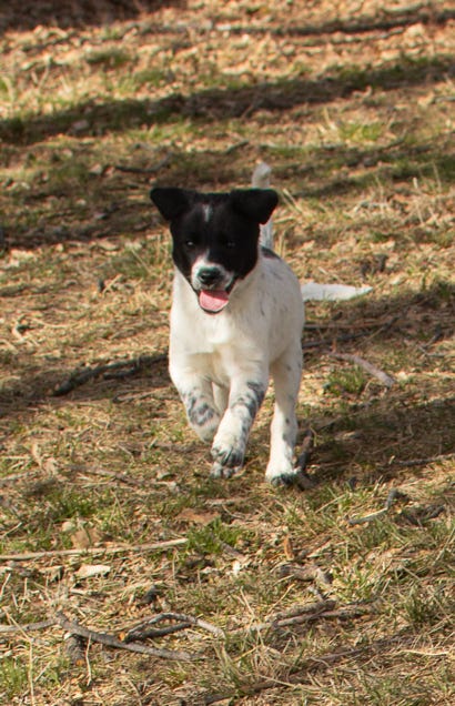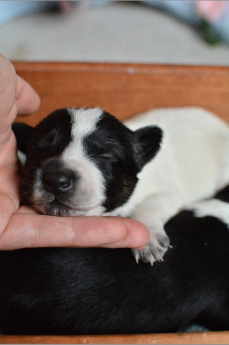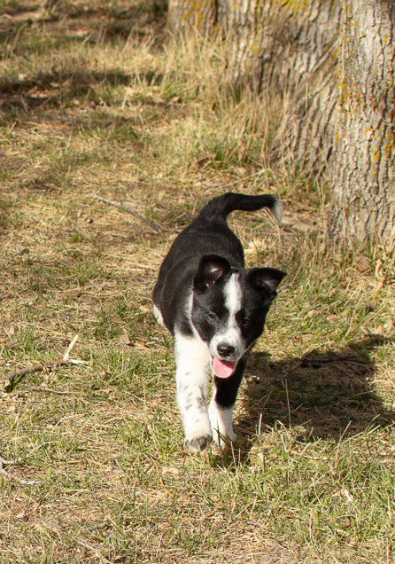 Buff is the last available pup of our 2022 litter. He is mainly white with black on his head and a black patch on his back, and lots of freckles!